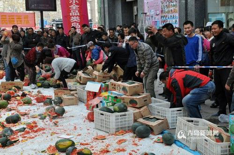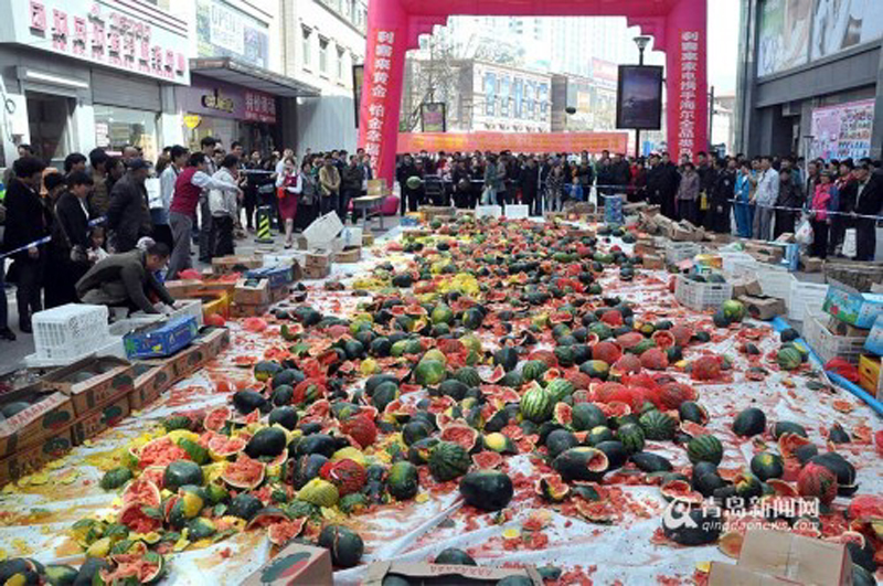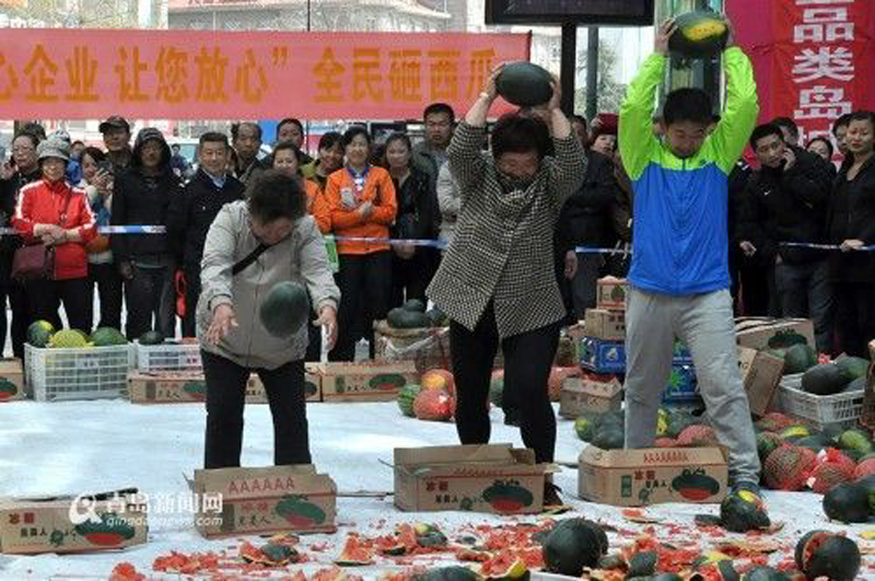 早前十多名市民因進食來自海南萬寧西瓜中毒入院,後來檢查時發現,西瓜的殘留農藥超標。17日上午,青島一個商場舉行一場「全民砸西瓜」活動,向殘留農藥超標的毒西瓜說「不」,眾多青島市民親手銷毀了問題西瓜事件後被下架的西瓜,銷毀總重量超過4噸。 (中國日報網)