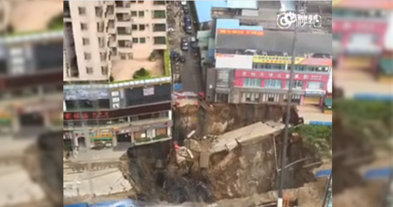 東莞市常平鎮發生地陷意外,有人拍到事發情形,只見整條路面瞬間下陷,留下近300平方米大坑。事件中一名工人喪生。