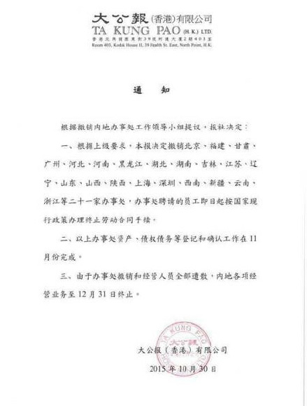 有北京傳媒人今日在微博貼出親中媒體《大公報》在上月30日的通告,指該報撤銷內地各省市21間辦事處,在內地各項業務至12月31日終止,並遣散全部辦事處員工,即日起辦理終止勞動合同手續。