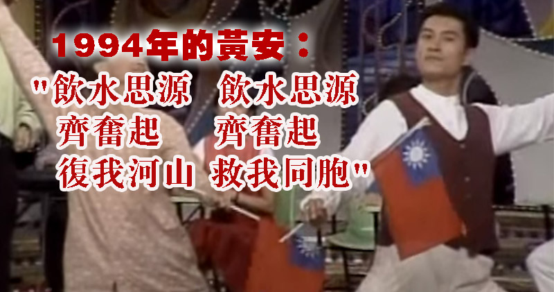 不過,這次國旗風波卻引來網民翻看過去黃安上節目時的短片,發現在1994年台視的《龍兄虎弟》節目上,黃安和藝人費玉清合唱《國恩家慶》一曲,歌詞最尾幾句是:「飲水思源,飲水思源;齊奮起,齊奮起;復我河山,救我同胞;到那時,到那時,家家歡慶樂陶陶」,這時黃安就掏出青天白日滿地紅旗,並擺出架勢。