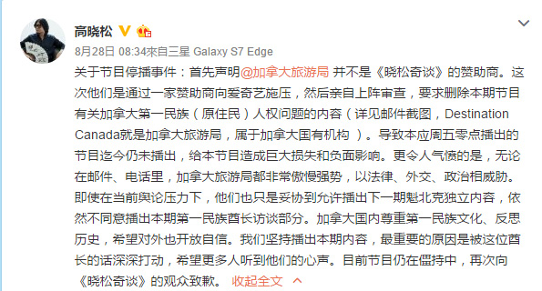 任職阿里巴巴旗下阿里音樂集團董事長的高曉松,在上周六於微博發文,指加拿大有關部門阻撓其節目《曉松奇談》播出,並指有關部門說「原住民人權和魁北克獨立是絕對不能提的」,指如果節目播出會「上升到政治高度造成非常嚴重後果」。他隨後貼出聲稱是加拿大旅遊局旗下機構Destination Canada的郵件,指出節目「要規避原住民話題」,並指官方機構絕不能提及,「就像藏獨在中國一樣」。