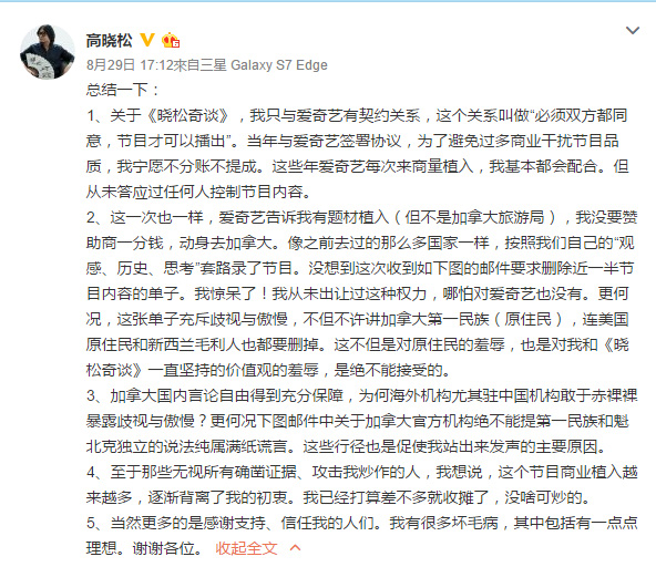 高曉松又在微博批評加拿大旅遊局「非常傲慢強勢,以法律、外交、政治相威脅」,其後又補充加拿大旅遊局提出節目刪除內容達20分鐘,形容「不能接受」。