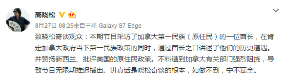 加拿大總理杜魯多訪華在即,卻爆出加拿大阻撓內地清談節目播出事件。內地清談節目主持人高曉松日前於微博稱,原定於上周五(8月26日)播出的節目《曉松奇談》被加拿大當局「強烈阻撓,導致節目無限期推遲播出」,並指是因其在節目訪問加拿大原住民酋長、討論原住民政策所致。