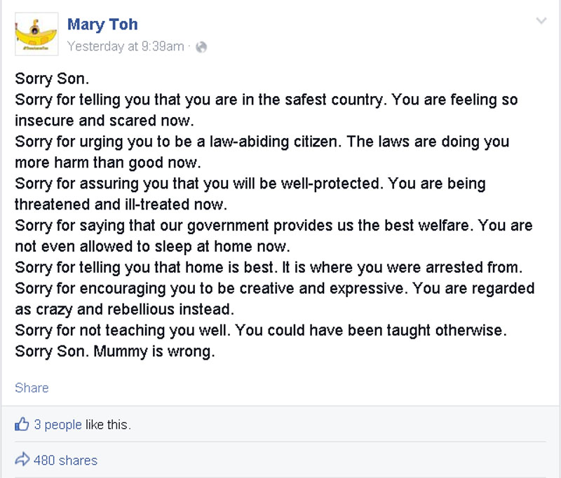 Mary Toh向兒子道歉,「對不起,告訴你在最安全的國家,你現在卻感到不安和驚慌」,「對不起,督促你成為一個守法的公民,但法律正為你帶來弊多於利。」