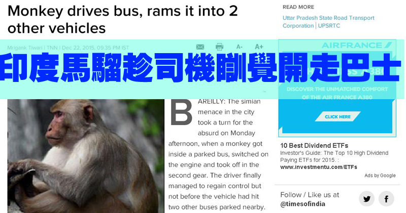 上周一中午,印度北部有巴士司機午睡時,將巴士停泊在車站,詎料一隻猴子趁機爬上駕駛座並開啟引擎。司機醒來後馬上衝向駕駛座,雖然搶回巴士控制權,但無奈巴士已撞上停泊在附近的兩部巴士,猴子亦趁機跳出巴士。