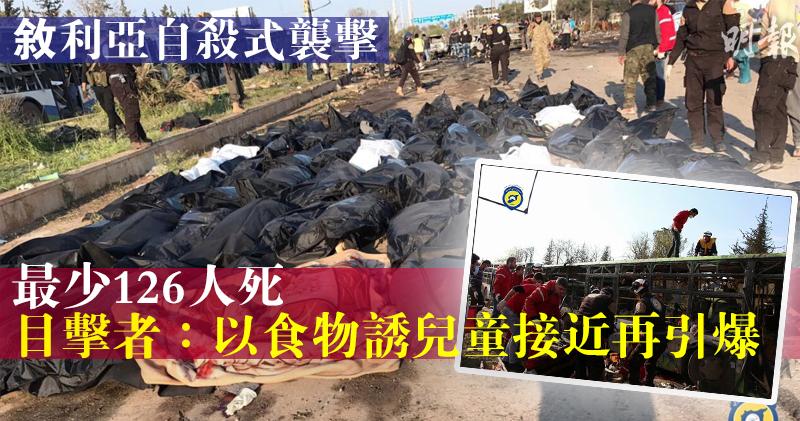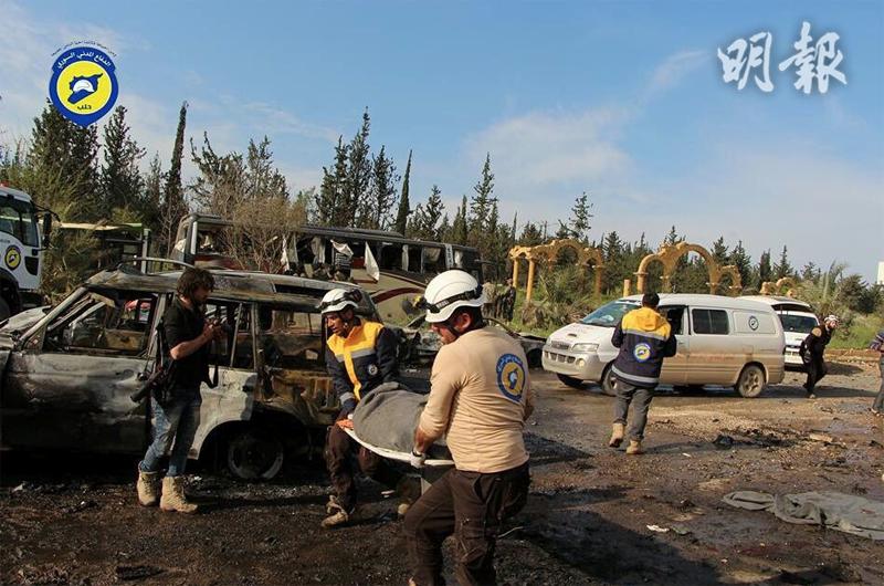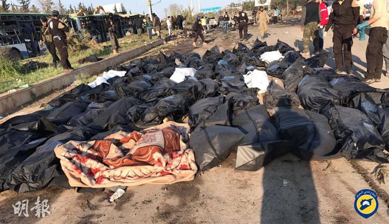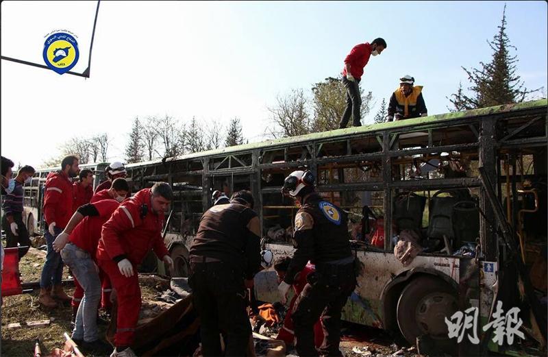 反巴沙爾的「敘利亞人權監察」稱,由約30輛旅遊巴組成的車隊,早前從福阿與卡夫拉亞接載約5000民眾撤離,上周五(14日)抵達位於阿勒頗以西反對派控制城鎮拉希丁(Rashidin)的交接點。惟雙方交接時因撤出的武裝人員人數產生分歧,兩車隊滯留逾1天,車上民眾缺水缺糧。及至上周六,一輛疑似運載救援物資的客貨車,於當地時間下午3時左右駛向旅遊巴車隊,並引爆車上炸彈,數輛旅遊巴被波及起火,造成最少126人死亡,其中109人為撤出民眾,包括68名兒童,其餘則為護送車隊的反對派人員與救援人員,由於傷者眾多,料死亡人數將續升。