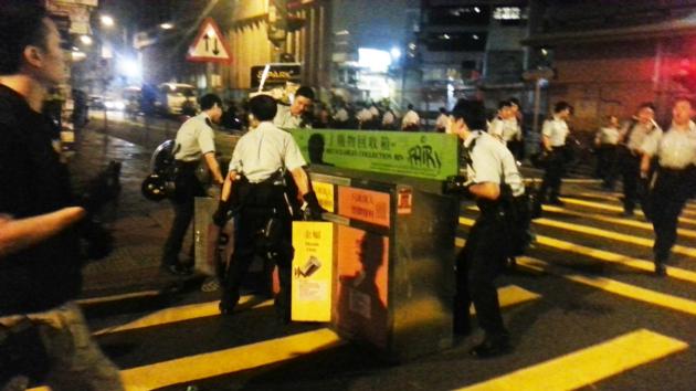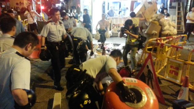 示威者從洗衣街到奶路臣街,從花園街道到登打士街,不停改變行動的地點。其間,又企圖在金聲戲院門外以垃圾桶堵塞馬路,警方趕至驅散人群並拘捕一名男子,人群又轉往登打士街。另一批示威者則在亞皆老街及洗衣街一帶嘗試再築路障,引發警民衝突,大批警員須狂奔而至阻止示威者。