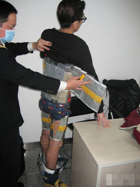 事發於昨晚8時許,身穿紅色運動衣和黑色運動長褲的年輕香港男子,在福田口岸旅檢入境大廳入境時,因他走路姿勢怪異,關節僵硬,肌肉緊張,似乎正在背負重物走動,但手上卻只帶着兩個輕便膠袋,關員覺可疑下將他截停檢查。