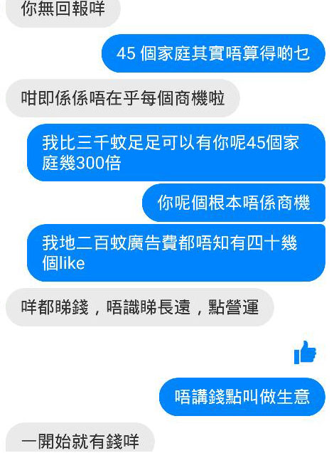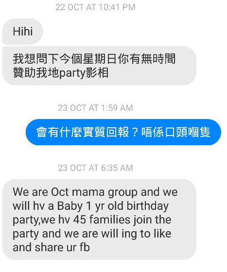 有媽媽會辦嬰兒1歲派對,家長欲請攝影師免費拍攝作「贊助」派對,並以參加派對的家庭讚好和分享攝影師的facebook作交換。攝影師與家長經手機通訊程式文字對話後,拒絕提供免費服務。