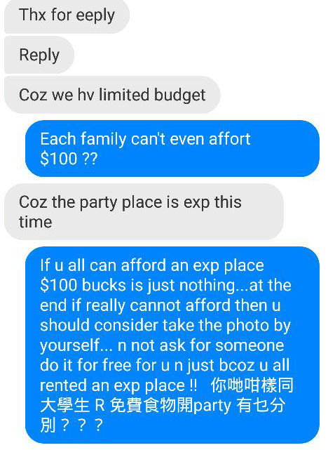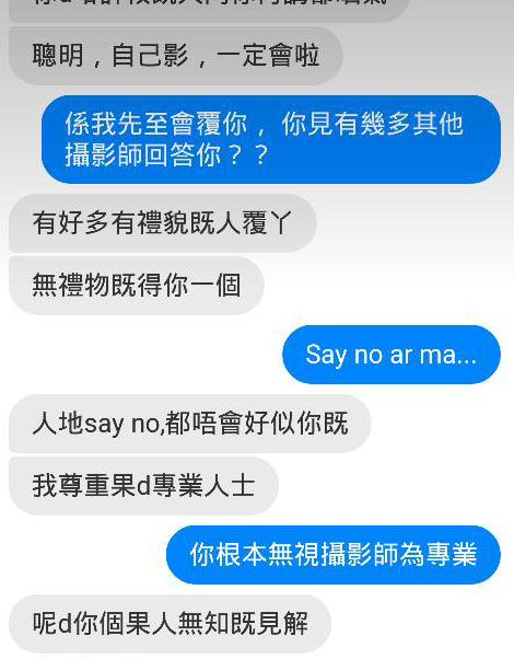 Marcobilly指過去都收過類似要求,「一個月有一單、半單」,他指平時都不會回覆,但據聞該母親漁翁撒網地找過多名攝影師,有行家都收過她同樣的要求,因此特意回覆,嘗試改變她對攝影師不正確的態度。