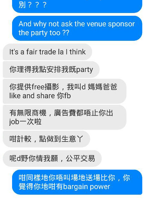 上載有關對話的攝影師Marcobilly Chong回應本報查詢指,所謂的贊助,其實就是做義工,若活動是有意義,免費拍攝都值得,但這活動根本不值得幫。
