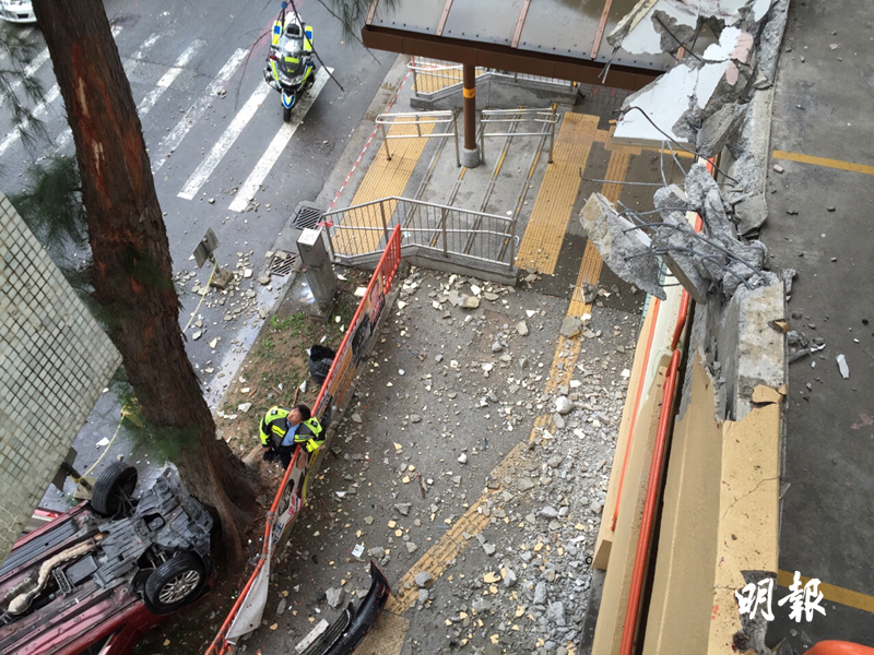 現場所見,停車場外牆被撞爛,懷疑是先撞到大樹再墮地。四輪朝天的紅色私家車嚴重損毀,車內物品碎落一地。