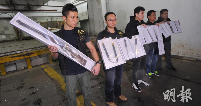 西九龍總區反三合會行動組人員根據線報及經深入調查後,今晨約9時突擊上址兩個單位,在其中一個單位內檢獲3把刀、一枝雙節棍、一枝仿製長槍及小量冰毒,並拘捕單位內2女1男,再於另一個單位內檢獲10把刀,另拘捕2名男子。