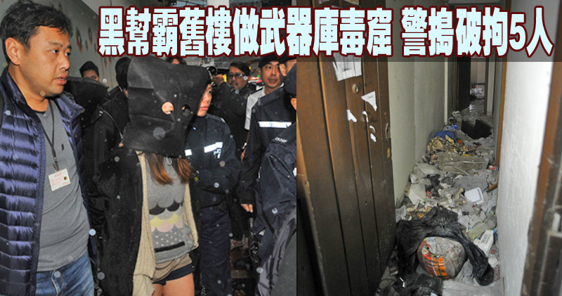 被捕3男2女年齡介乎26歲至49歲,均報稱無業及朋友關係,持有本港身分證,當中一人來自越南,其餘人士為中國籍。據悉,當中3男1女有黑幫背景,所有被捕人士涉嫌「藏有攻擊性武器」、「藏有仿製槍械」及「藏毒」罪,將被通宵扣查。