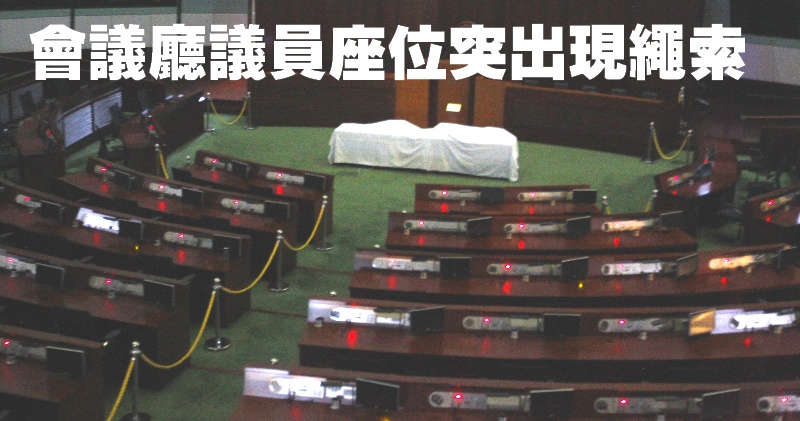 立法會網頁顯示,明後兩日會議仍定於「會議室1」舉行,惟本報記者今午發現,會議廳主席椅前方,已擺放了由白布遮蓋的長形設置,相信為長桌,部分議員座位亦被黃色繩索隔開。