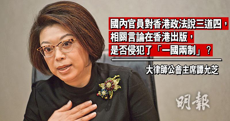 港澳辦主任王光亞昨回應銅鑼灣書店事件時,斥責銅鑼灣書店店主林榮基在香港出版攻擊內地政治制度書籍,再拿到內地售賣,本身破壞「一國兩制」。不過大律師公會主席譚允芝今天出席民主思路論壇時質疑說,若國內學者和官員對香港的法制和政治體系說三道四,相關言論在香港出版,這樣是否侵犯了「一國兩制」。