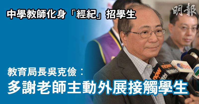 升中統一派位日前放榜,有傳媒發現部分有收生弱勢的中學,派出老師化身「經紀」,到觀塘學位註冊組門外招攬新來港學生,盼藉此取錄更多學生。教育局長吳克儉今日表示,「多謝老師主動外展接觸學生」,認為此舉可針對新來港學童,讓他們得到充分資訊。 至於三個月前成立的防止學生自殺委員會,將於本月提交中期報告,吳克儉指,委員會料7月尾前提交附有即時建議的中期報告,10月則提交包括學生自殺成因、應付及解決方案及建議的全面報告。其他報道:女拔萃生英音樂賽奪冠 師父:不收被迫學唱歌學生其他報道:5歲女吐血求醫後出院 兩周後暴斃 母疑威院斷錯症其他報道:得州槍擊案增至5警死 達拉斯封鎖領空相關字詞﹕編輯推介
