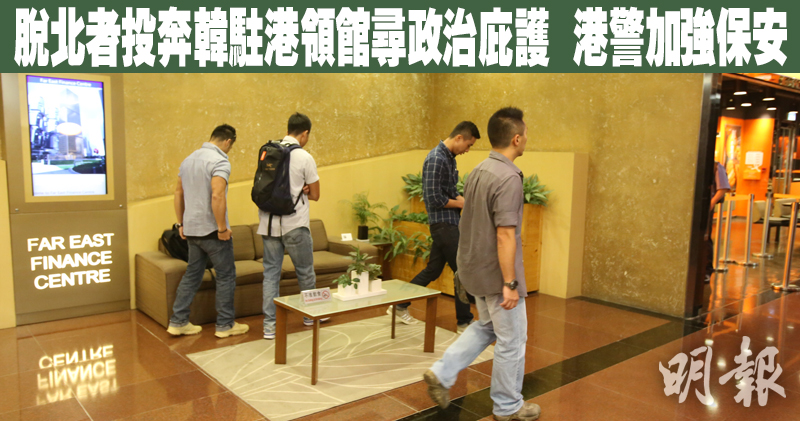 消息指,該名朝鮮男子早前入境本港,其後到金鐘遠東金融中心5樓的韓國駐香港總領事館尋求政治庇護,獲准逗留在領事館內,至今未有離開。