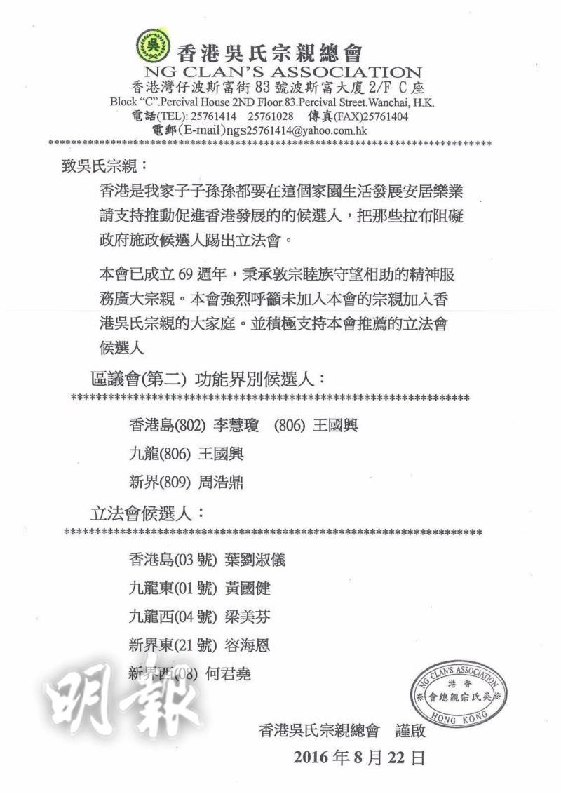 立法會選舉周日(9月4日)舉行,《明報》接獲一份據稱由吳氏宗親總會向「吳氏宗親」發出的推薦投票名單,又指明要把「拉布」阻礙政府施政的候選人踢出立法會。「吳氏宗親總會」暫未回覆查詢。