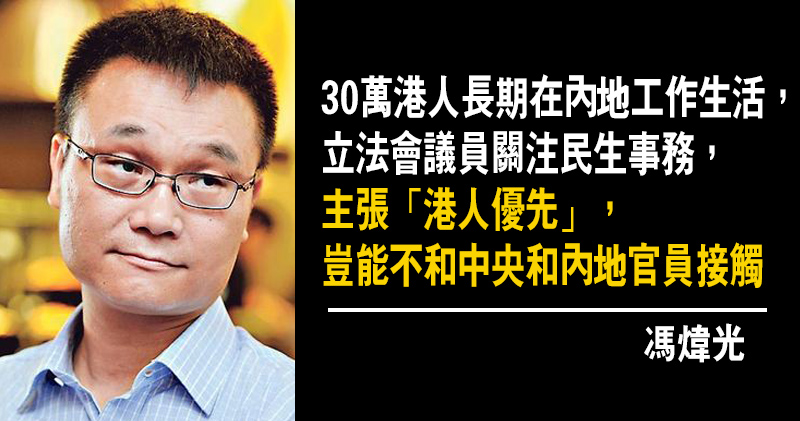 馮煒光昨以〈立法會要務實〉為題於《am730》撰文,提到香港現有逾30萬居民在內地長期工作、生活及求學,香港食水和副食品亦主要由內地供應,形容這些香港勞動人口的福祉和港人每日生活所需,都需要香港和中央及地方政府有良性互動,強調「立法會議員關注民生事務,主張『港人優先』,又豈能不和中央和內地官員接觸,難道置這30多萬香港居民的福祉於不顧?」