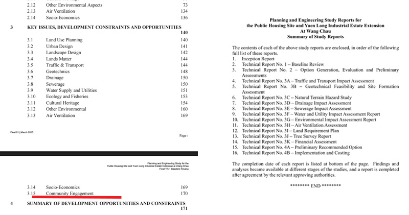 文件顯示,16份報告涵蓋交通影響評估、地理環境可行性及選址評估、污水影響評估、空氣評估、樹木評估、財政評估等部分,其中在第二份的基線評審報告(Final TR-1 Baseline Review)中,有關於社區參與(community engagement)的部分。另外,在交通研究報告中,目錄4.2-4.4列明,造路包括三部分,南面公屋、北面公屋及元朗工業邨擴展部分,未知是否與政府早前所說的,分三階段發展有關。