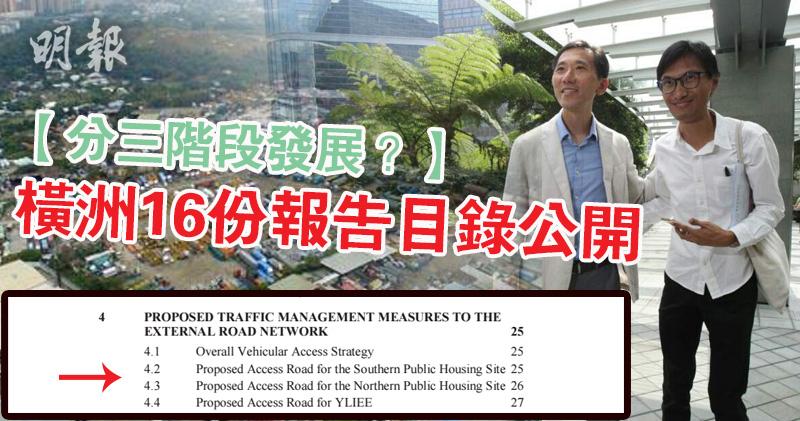 朱凱廸及姚松炎在今日中午與運房局長張炳良及發展局長陳茂波會面時,要求局方今日交出橫洲計畫報告的封面、目錄及研究範圍,政府晚上公開報告目錄,當中交通研究報告的目錄中,列明造路包括三部分,未知是否與分三階段發展有關。