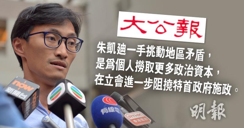 社評題為<捏造「官商鄉黑」 朱凱廸「票王」更黑>,稱朱凱廸未有點出「橫洲發展」中「官商鄉黑」如何「勾結」、「黑」在哪裏,指摘他挑動地區矛盾,旨在為個人撈取更多「政治資本」,「日後在立法會進一步阻撓特首和特區政府依法施政」。