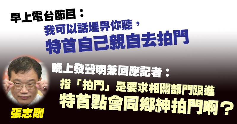 張志剛除了發聲明澄清特首「自己親自去拍門」的意思外,另回應本報查詢指,今早在電台節目所作的評論,是因應整體棕土政策,而非針對橫洲發展。他所講的「拍門」,亦只是形容特首在政府內部進行跨部門統籌,並指:「特首點會同鄉紳拍門啊?」