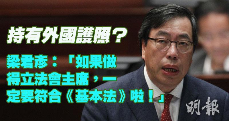 經民聯梁君彥是出任新一屆立法會主席呼聲最高的人選,但近日政圈流傳梁持有外國護照。記者就外國護照一事向梁查詢,梁不置可否,只笑言:「如果做得立法會主席,一定要符合《基本法》啦!」