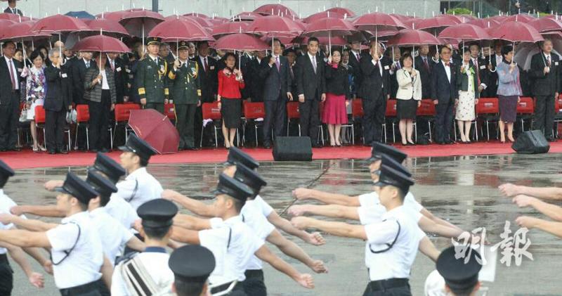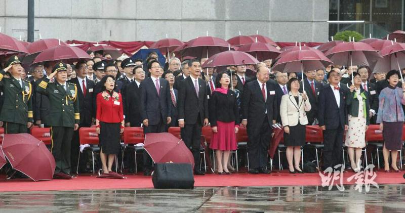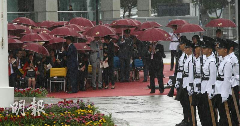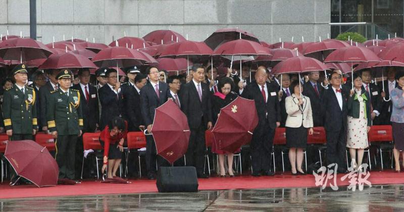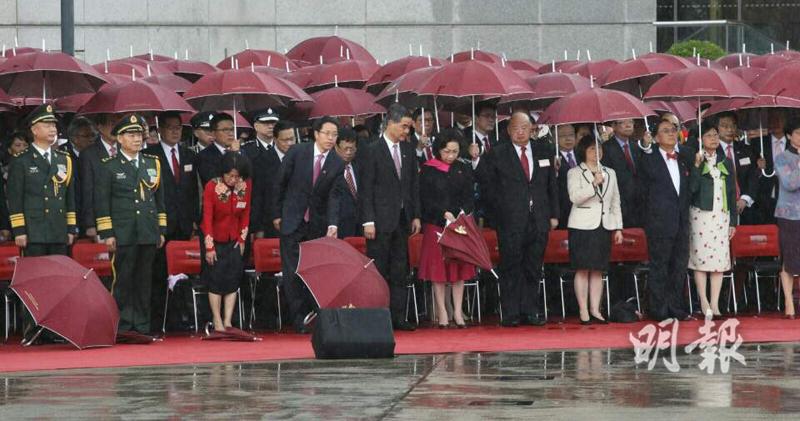 由於現場有雨,出席嘉賓都撐起紅色雨傘。到升旗儀式開始前,張曉明收起雨傘,站在一旁的梁振英看到張曉明收起雨傘後,其妻梁唐青儀亦收起為兩人遮雨的雨傘,而站在張曉明附近的嘉賓也收起雨傘。