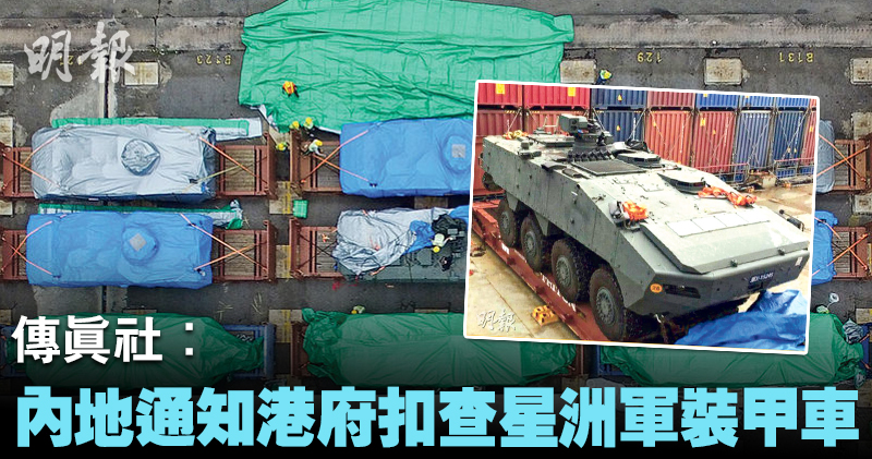 海關周三(23日)在葵涌一艘從台灣開往新加坡的貨船上,發現9輛屬新加坡政府的裝甲車,有關裝甲車被扣留在屯門內河碼頭海關驗貨場。傳真社報道指是內地部門通知港府扣查這批裝甲車。海關回覆《明報》查詢稱,不評論執法行動。