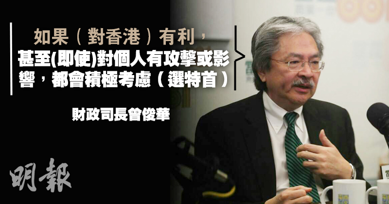 早前有報道引述消息稱,中央對財政司長曾俊華計劃參選特首一事亮「紅燈」,曾俊華今早出席電台節目時,再被問到是否參選,他稱這不是個人榮辱問題,要考慮作出的決定是否對香港整體有利,「如果有利,甚至(即使)對個人有攻擊或影響,都會積極考慮這件事」。