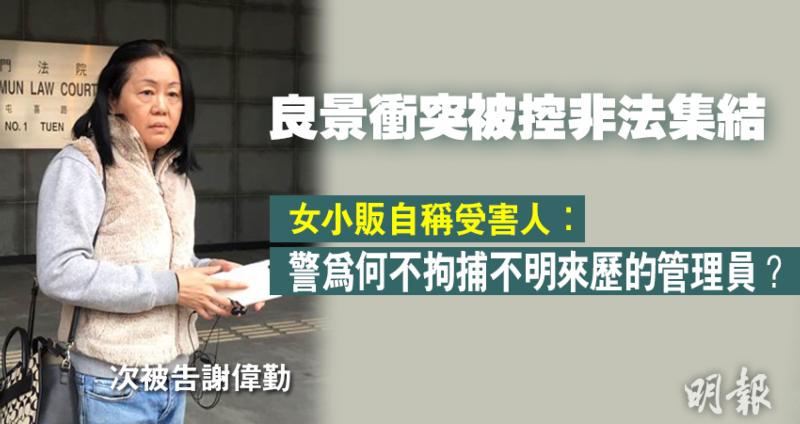 屯門良景邨今月2月初有多名小販在商場對開空地擺檔,其間有多名自稱「管理員」封路及清場,雙方爆發衝突,兩名小販被控參與非法集結,案件今於屯門裁判法院續審。