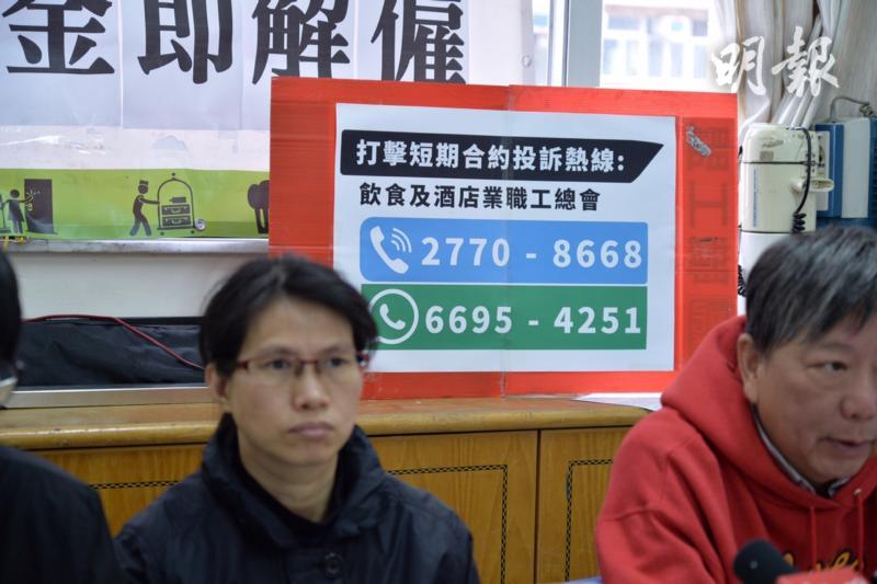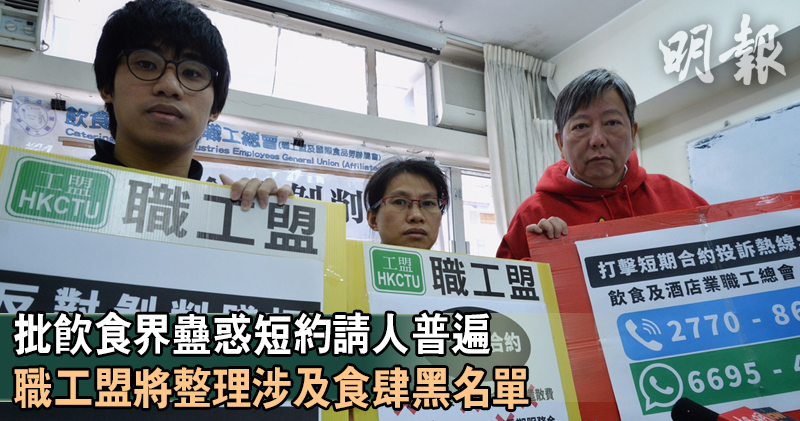 職工盟秘書長李卓人指出,勞方代表一直聲稱取消遣散費及長期服務金對沖將令中小企倒閉,然而飲食業界等卻以短期合約剝削員工,「張宇人成日話飲食業執笠,但根本僱主同僱員強弱懸殊,仲要有呢啲合約出現」。職工盟將成立投訴熱線,呼籲市民舉報以短期合約剝削員工的食肆,從而整理出一張黑名單,監察不良僱傭手法。