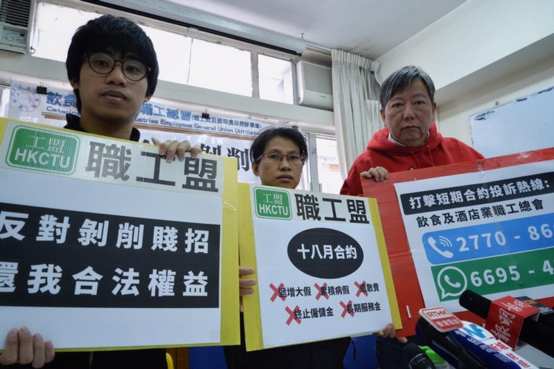 職工盟接獲一名會員求助,他於元朗一間酒樓任職點心師傅13年,但僱主以短期合約形式,每18個月就更新合約,令他的年資無法累積,被解僱時亦得不到長期服務金賠償。職工盟指飲食業以短期合約聘請員工非常普遍,他們將設立舉報熱線,整理相關食肆名單,並將約見飲食業界立法會議員張宇人要求跟進。