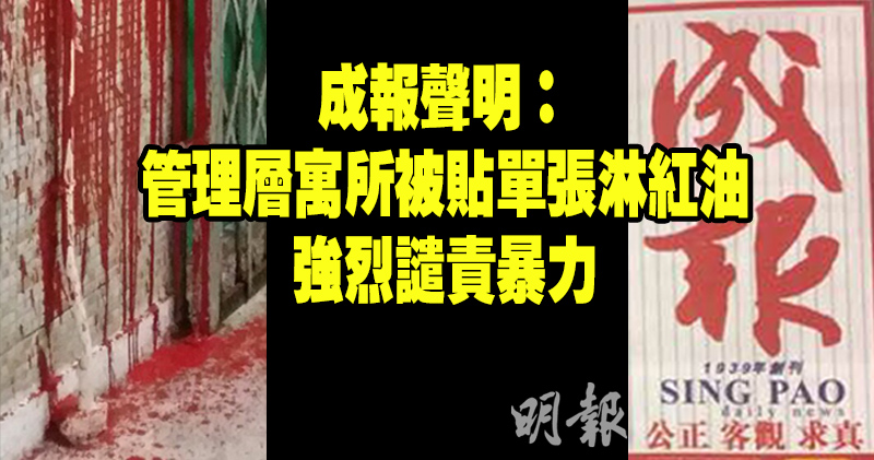 《成報》繼上周二(21日)發聲明指,報館管理層遭人跟蹤、偷拍及貼附有樣貌的單張恐嚇和抹黑後,報館今日再發聲明,指今日清晨時分,再有個別管理層寓所被張貼單張恐嚇和抹黑,並在單位大門及牆上淋潑紅油,涉事員工已立即報警。聲明指,這是《成報》第4次報警,強烈譴責這種近似黑幫暴力的威嚇手段,要求警方盡快緝拿涉案者及幕後主腦。