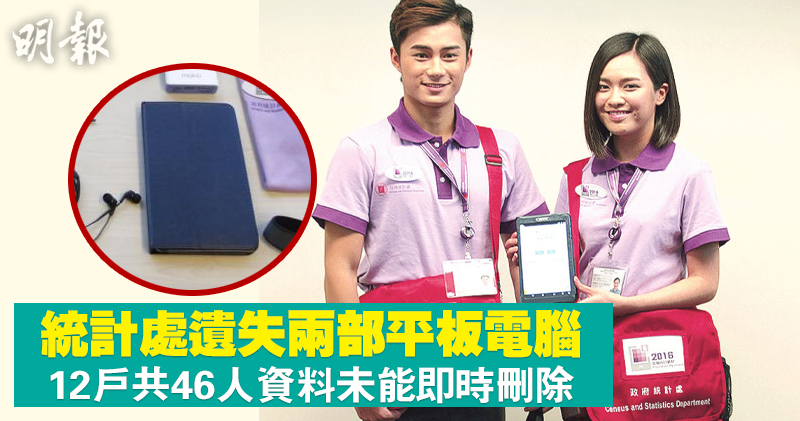 統計處去年6月底至8月進行中期人口統計,事隔9個月,統計處今日承認,於中期人口統計期間,曾遺失兩部平板電腦。其中一部載有12個住戶(包括46名人士)的資料,而未能即時刪除。