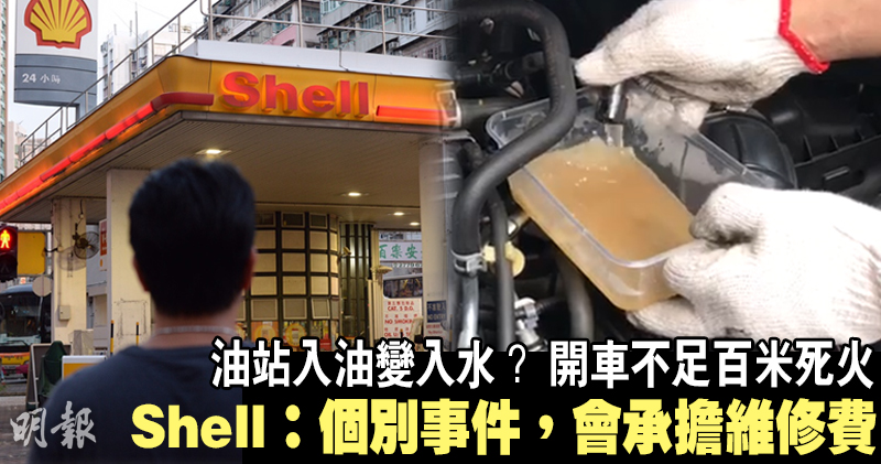 油站入油疑變入水?有市民上周二(23日)到深水埗大埔道蜆殼油站入油後,汽車行駛不足百米即死火「跪低」,經車房檢查,發現油缸疑被入了水。有油站經理指出,有多於一部車同樣入油後,發現油缸有水。香港蜆殼(Shell)發言人稱,今次只屬個別事件,事發後,已即時主動聯絡受影響客戶,協助將受影響車輛送交原廠維修中心檢驗及進行維修工作,會承擔有關費用。