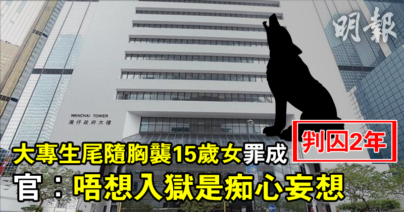 明德學院4年級男生尾隨15歲女生回家,在梯間胸襲對方後逃去,被捕後承認案發前曾跟隨事主,及到梯間「視察」環境,其後多次欲重施故技但失敗。他早前於區院承認一項非禮罪,法官今判刑時斥他冷血自私,稱他請求判處非監禁式刑罰是痴心妄想,判他入獄2年。
