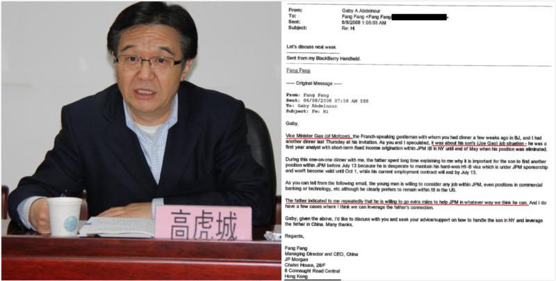 中國商務部部長高虎城或將陷入麻煩。《華爾街日報》今日引述多份電郵文件報道,高虎城在08年任商務部副部長時,曾要求摩根大通中國投資銀行業務首席執行長方方幫忙,解決高氏兒子高玨(Joe Gao)在摩通的任職問題。以此作交換,高虎城向方方答應,會為摩通在內地提供任何方便(whatever way he can)。