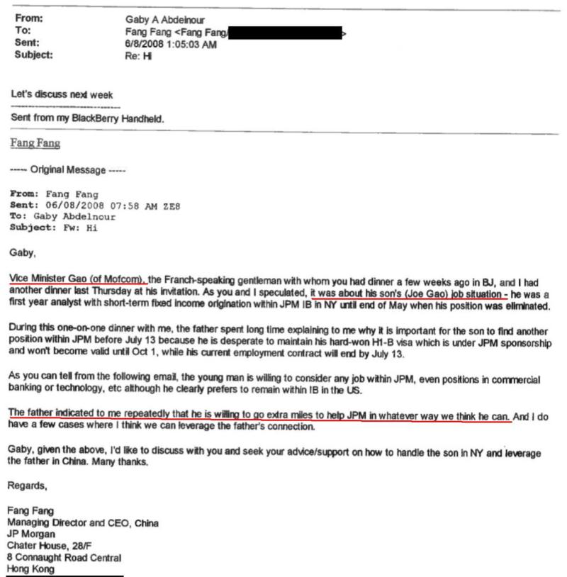 《華爾街日報》披露多份聲稱由方方與摩通多位高層的電郵,其中一封2008年的郵件內容是關於方方與商務部部長高虎城晚餐。電郵稱,高虎城的兒子高玨當時任職摩通紐約,但正面臨被裁員,高虎城向方方表示,如果摩通繼續雇傭他兒子,他願意為這家銀行「多做些事情」。結果,高玨在該行大規模裁員中保住了位置。