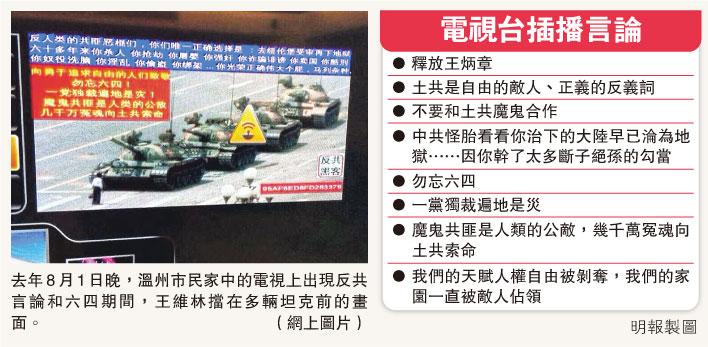 【明報專訊】去年8月1日晚,浙江溫州有線電視多個頻道突然出現「去×媽三個自信」、「共匪才是罪犯」等標語,並插播八九民運時王維林身擋坦克的畫面,電視台辯稱機頂盒疑遭黑客入侵。官方及後稱,疑犯為40歲的北京王姓工程師,為泄憤而破壞電腦信息系統傳播非法反動內容,在北京被拘。前日,溫州法院認定王犯破壞電腦信息系統罪和誣告陷害罪,且其行為「影響惡劣,社會危害性大,應酌情從重處罰」,判囚12年,剝奪政治權利兩年,並罰款10萬元(人民幣,約12.5萬港元)。