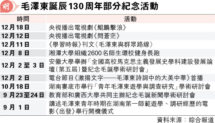 例如,本月初安徽大學舉辦「全國高校馬克思主義發展史學科建設發展論壇(第五屆)暨紀念毛澤東同志誕辰130周年學術研討會」,來自中央黨校、社科院、中國延安幹部學院、北京大學等院校的逾百名學者參加。