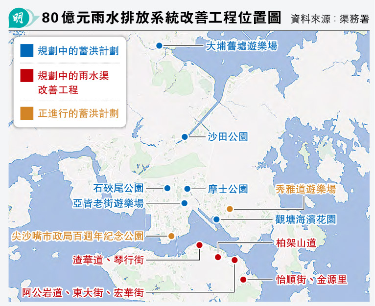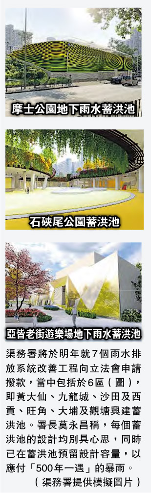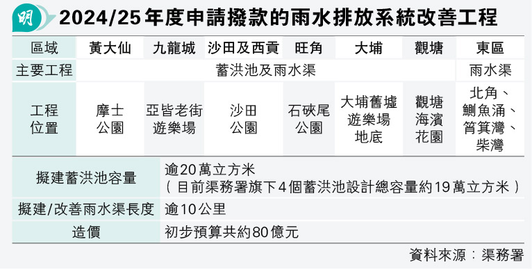 另一方面,雨水排放系統改善工程亦馬不停蹄。莫永昌說,當局規劃23個項目,並已檢視及調整雨水排放系統改善工程的優次,預計明年就當中7個雨水排放系統改善工程設施(見表)到立法會申請撥款,有望明年開展工作,最快2027年分階段建成部分設施。
